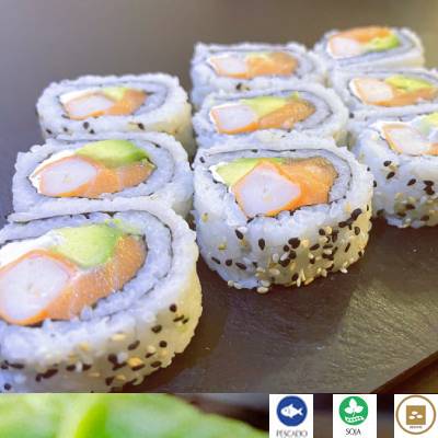 Salmón, surimi, aguacate, philadelphia y sésamo