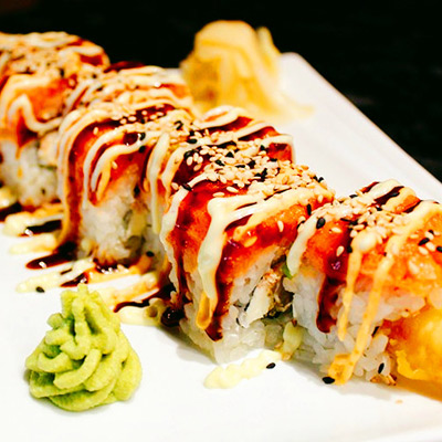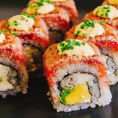 8 piezas ruson(carne molida), langostin en tempura, aguacate, queso philadelphia, y sesamos, salsa unagi (angilla)