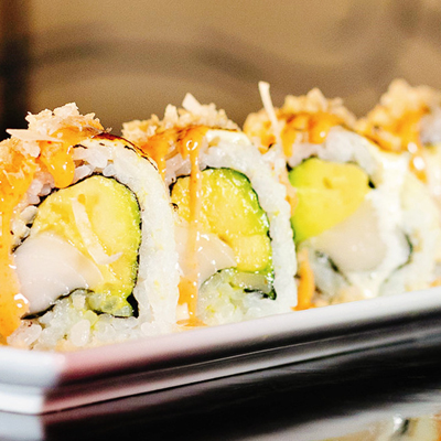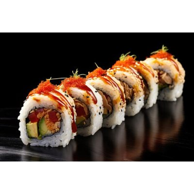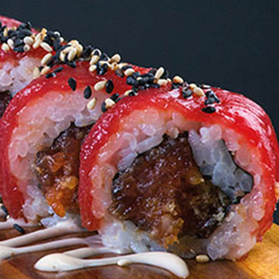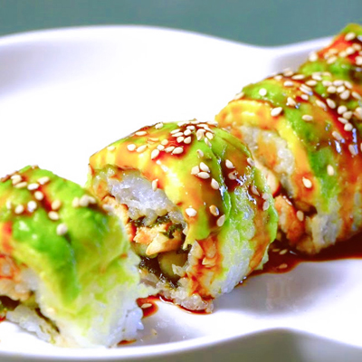 Aguacate, pollo tempura, teriyaki, sésamo y philadelfia